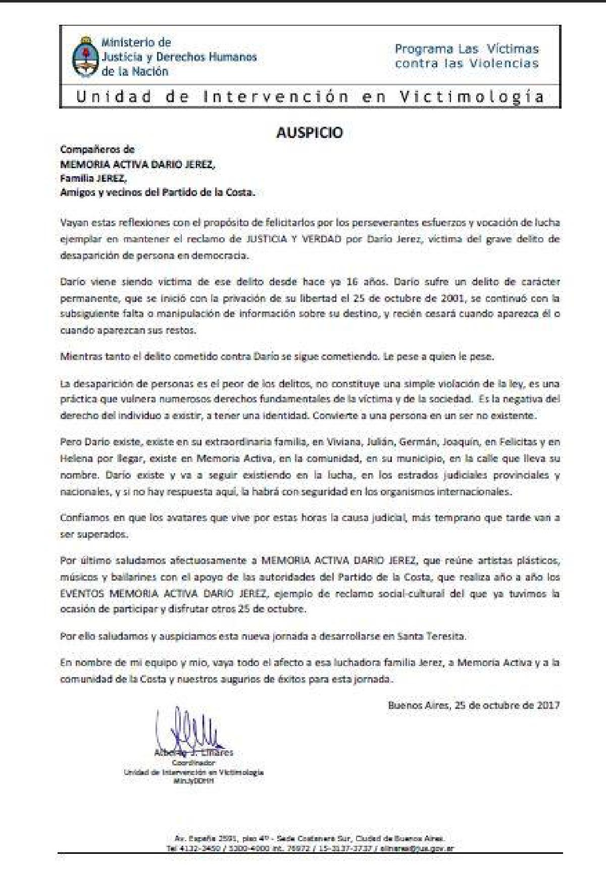 Carta de apoyo del Ministerio de Justicia y Derechos Humanos de la Nación